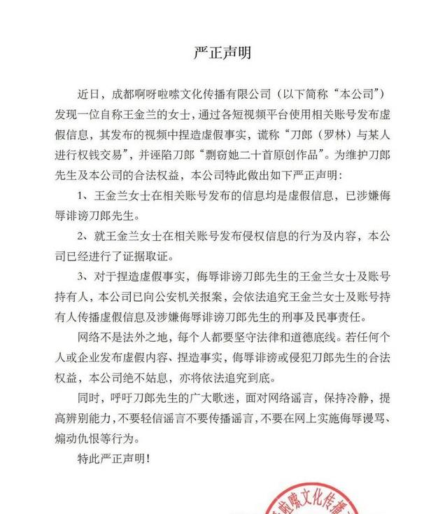 面对刀郎公司发出的澄清和报警,王金兰并没有放弃,她主动发布了维护自己权益的公告,强烈要求刀郎旗下的呀啦嗦公司停止抄袭行为,并且再次公布了20首她声称被剽窃的歌曲。