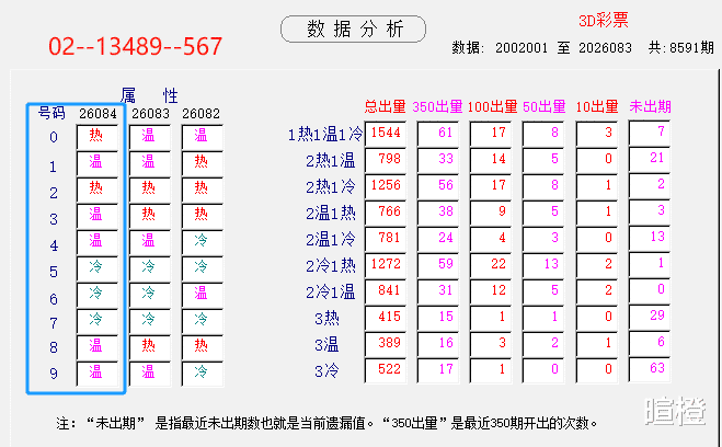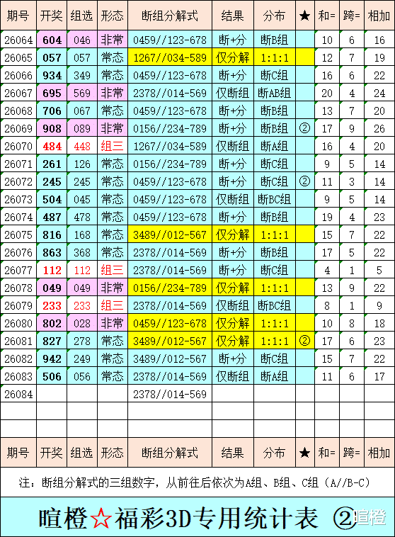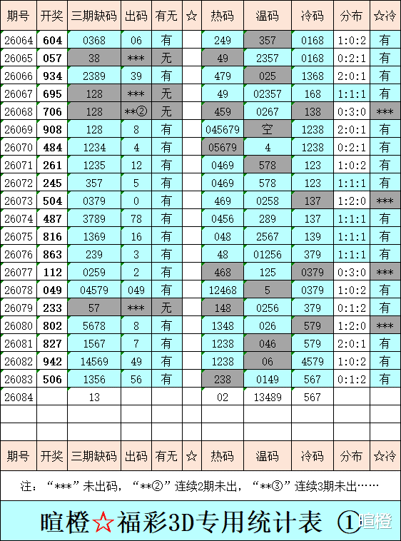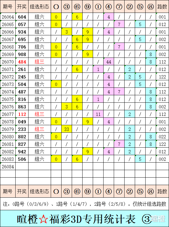 26084期:暄橙福彩3D综合条件(本期将在4月4日21:15开)一、上期回顾 ☆1、上期开奖号:5 0 6。2、和值= 11,跨度= 6。3、常态组六,002路组合。4、热度分布(热:温:冷)0:1:2。二、本期条件 ☆1、三期缺码:13。2、热:02,温:13489,冷:567。3、断组分解式:2378//014-569。4、四胆:3468;三胆:368。三、术语解释 ☆1、三期缺码:0至9这十个自然数当中,未在近三期开奖号出现的数字。2、热度(热温冷):自然数0至9,在近七期开奖号中,出现3次及3次以上的数字,称为热码;出现2次的数字,称为温码;出现1次和未出现的数字,称为冷码。某个数字在开奖号中出现几个,就按几次计算。3、断组分解式:将0至9这十个自然数,分成三组数字,从前往后依次为A组(4码)、B组(3码)、C组(3码),一般情况下,有一组数字不出码,偶尔会有两组数字不出码。A组不出码的情况相对较少。断组为主,分解为辅。4、常态组六号码:同时包含大数、小数、奇数、偶数、质数、合数的组六号码,共有72注。统计表中,简称“常态”。5、非常态组六号码:全大数、全小数、全奇数、全偶数、全质数、全合数等六种形态的组六号码,共有48注。统计表中,简称“非常”。★提醒:彩市有风险,参与须谨慎!水平有限,仅供参考!