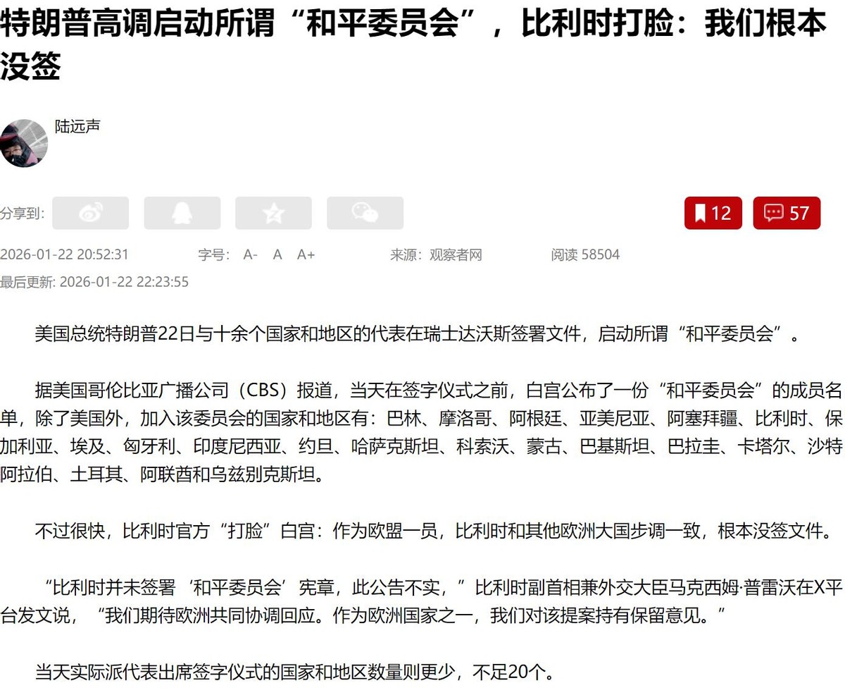 1月22日,特朗普直接在当场就特地搞了一个加入和平委员会的签字仪式,用来向全球彰显美国的影响力。在签字仪式上共有19个国家加入了和平委员会。名单具体如下:阿根廷、沙特、土耳其、匈牙利、巴基斯坦、埃及、印尼、阿尔巴尼亚、亚美尼亚、阿塞拜疆、白俄罗斯、约旦、哈萨克斯坦、科索沃、科威特、摩洛哥、巴拉圭、卡塔尔、乌兹别克。
