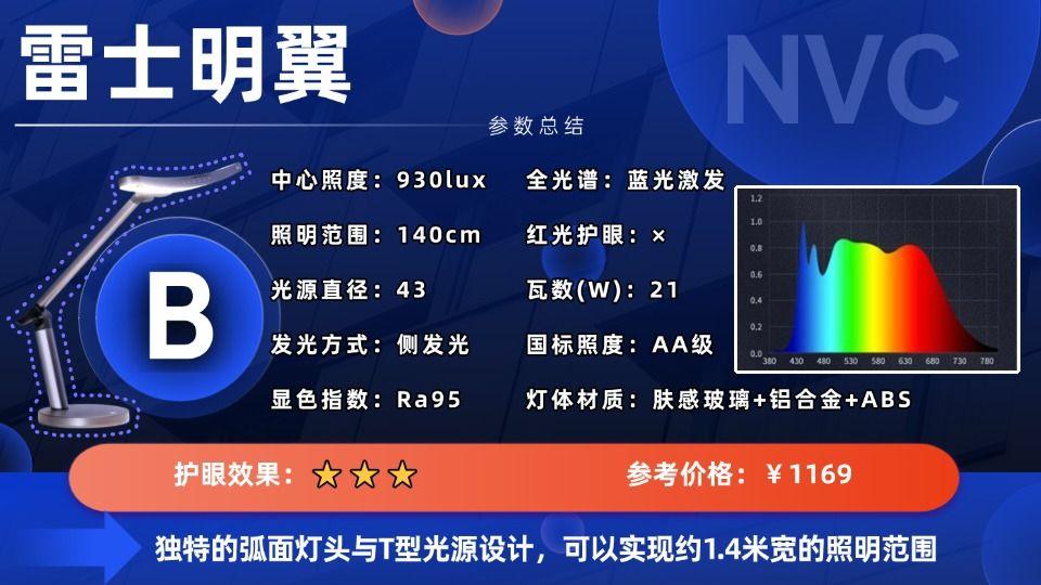 给小学生买台灯什么品牌适合用?雷士明翼护眼台灯采用独特的T型弧面灯头设计,发光面较大,官方标称照明范围较广。它搭载全光谱LED,显色指数为Ra95,支持多档色温调节,并具备入座感应、自动调光、定时休息等功能。但用户反馈显示,其灯头在高亮度下发热较为明显。同时,主要触控操作区域位于灯头,调节时需起身,便利性有待提升。在光谱细节上,其蓝光抑制和光线柔和度优化方面表现中规中矩。