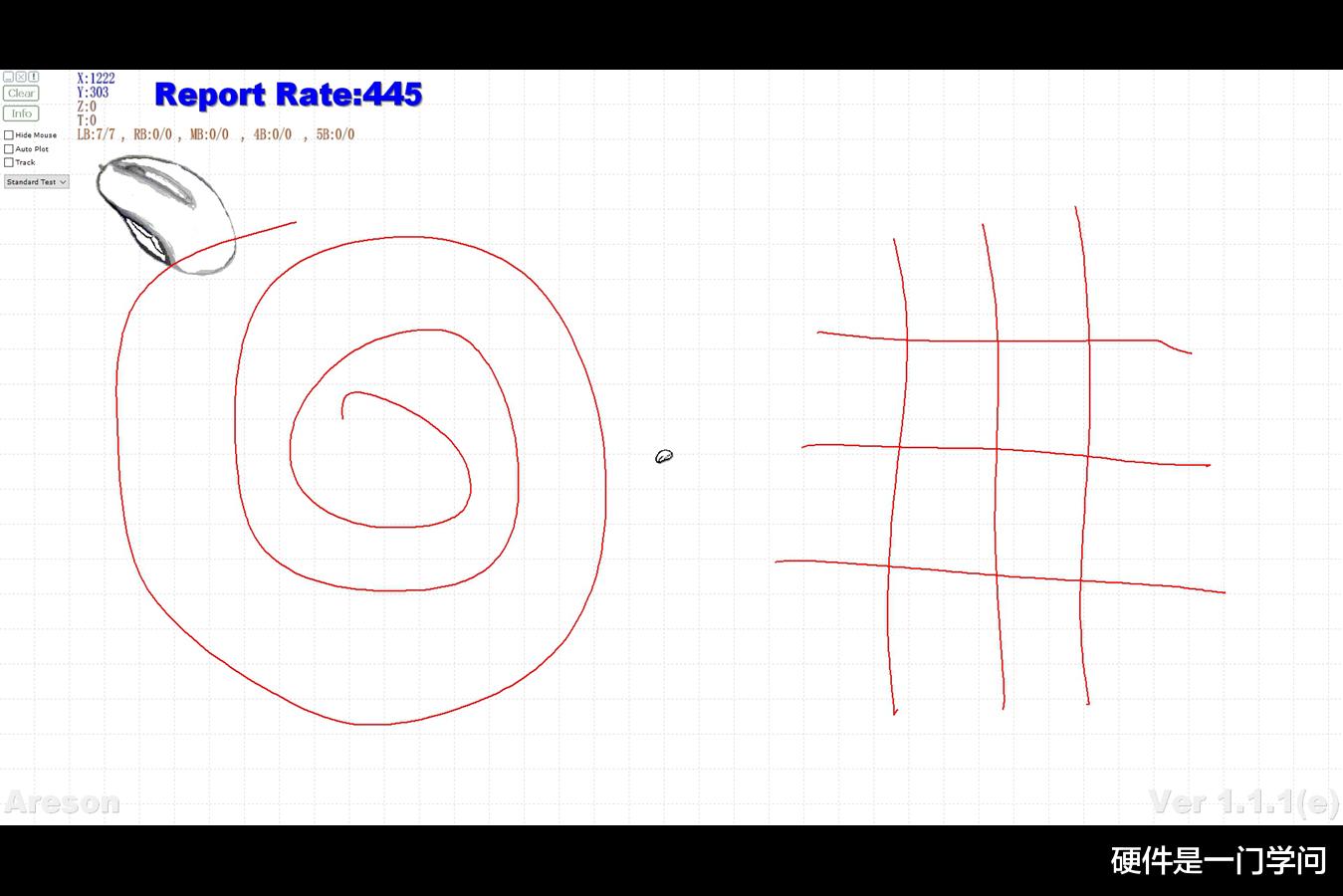 对GPW2金刚版简单的进行了MouseTest测试,设置1600DPI,蚊香图线条连贯、流畅,锯齿感不强,井字横线和竖线直线修正不明显。