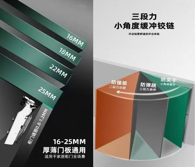 先说说大家最头疼的旧铰链问题:老式一段力铰链,关门全靠撞,半夜开柜门,一声巨响能吵醒全家;普通二段力看着有缓冲,可小角度(15° 内)还是有盲区,关门依然有撞击声,用久了阻尼失效,门板晃悠、缝隙变大,厨房油烟、浴室湿气一浸,还容易生锈松动。