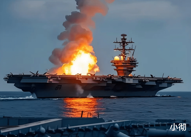 如果伊朗击中美航母,将是开战伊朗取得的最大战果,但消息有待验证。图为网友做的美军航母被击中的效果图