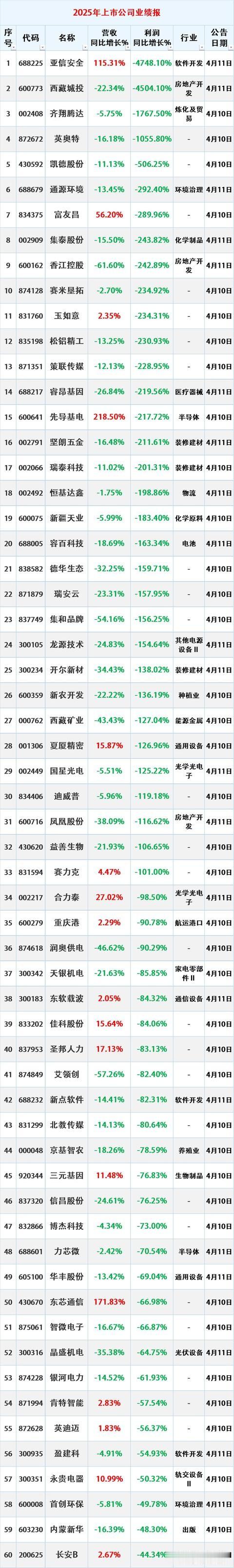 4月11号,158家公司业绩大变脸,说实话,里头不少数字看着让人心里一紧——好些公司那利润不是腰斩的事儿,是直接往地底下钻。拿亚信安全来说,净利润同比降了四千七百多个百分点,西藏城投也好不到哪儿去,降了四千五百多。齐翔腾达、英奥特、凯德股份这几家,下滑幅度也都过了五倍的线。