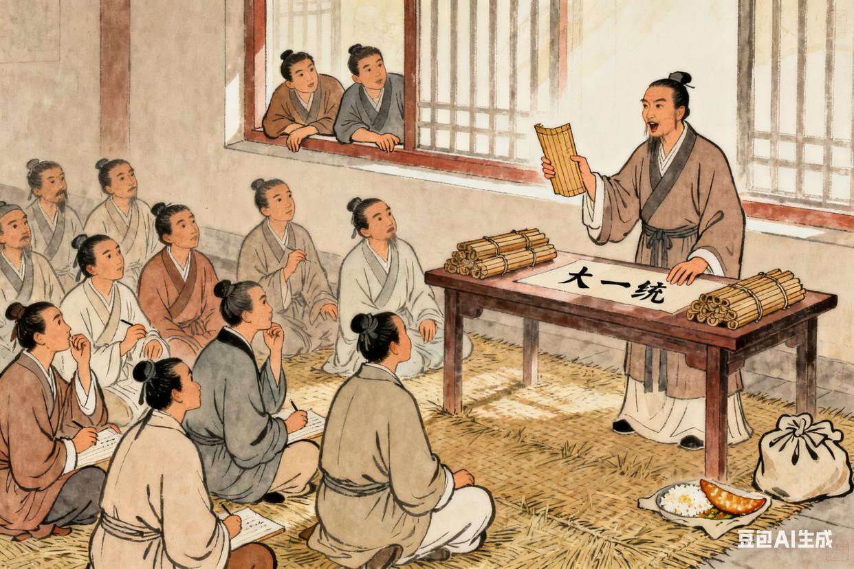 汉景帝即位那年,董仲舒终于被召到长安做博士。可这博士当得清闲,景帝虽不排斥儒家,却也没把儒家当回事,朝堂上还是黄老派的天下。他在博士官署里开了个小讲堂,木简一捆捆堆在旁边,来听课的弟子挤得满屋子都是,后排的人看不见,就趴在窗台上听。他讲“大一统”的时候,声音不高,却透着股认真劲儿,手里拿着竹简比划,讲到激动处,就把竹简往案上一放,反问弟子“天下分崩,何以安之?”有次讲完课,弟子们围着他问问题,他从怀里掏出个布包,里面是母亲腌的咸菜,就着冷饭吃,边吃边答,眼神里满是期待——他盼着有一天,这些道理能真的用到治国上。