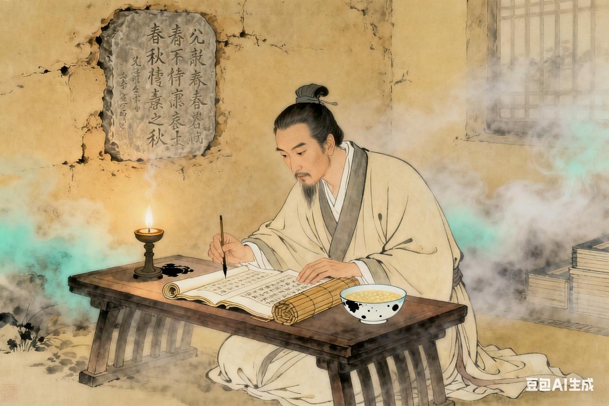 建元元年的临淄,秋晨的雾还没散,董仲舒的书房里已经亮起了油灯。灯芯跳动着,把他的影子投在土墙的《春秋》刻石上,忽明忽暗。案头摊开的《公羊春秋》边缘已经卷了毛边,他指尖蘸着磨好的松烟墨,在竹简上写注释,墨汁偶尔滴在案角的小米粥里,他没察觉——粥凉了,他没尝;窗外的园子里,去年种的菠菜早被杂草盖过,他没看。