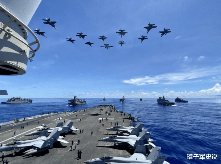 最外层是舰载预警机和战斗机组成的防空网,E-2D预警机能在550公里外发现目标,F/A-18和F-35战机则负责拦截。
