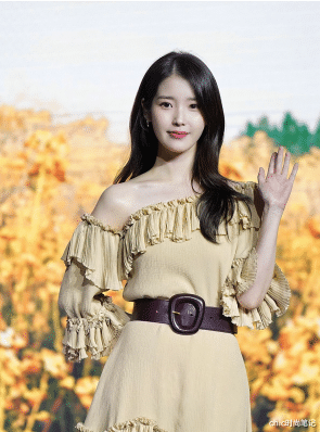 剧外的IU走得更多的是小清新路线,身穿鹅黄色露肩连衣裙,不规则的木耳边在领口与袖口处巧妙分布,用一条宽版棕色腰带作为穿搭的时髦搭配。