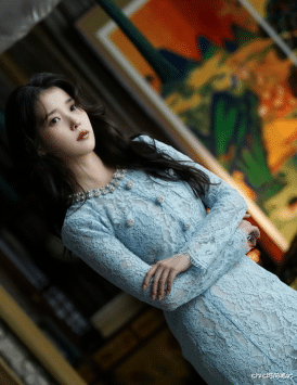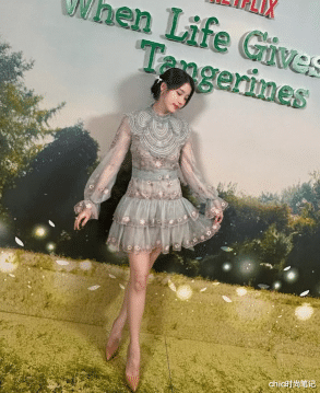 柔纱与蕾丝的融合带着精致与淑女,裙身上的碎花刺绣又是重工与清新的搭配,层层叠叠的裙摆带着温柔与甜美,很适合少女感十足的IU。