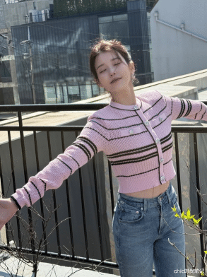 粉色条纹针织衫是做了短款得设计,搭配浅蓝色修身牛仔裤,小露腰身的穿搭带着治愈与松弛的氛围感。