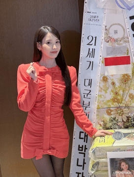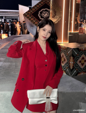 IU剧宣时的穿搭也是完美契合剧中女主的地位与风格,一身红色连衣短裙上点缀着蝴蝶结和规则褶皱设计,衬得人精神状态极佳,配上黑色丝袜作为点缀,经典的红与黑搭配。