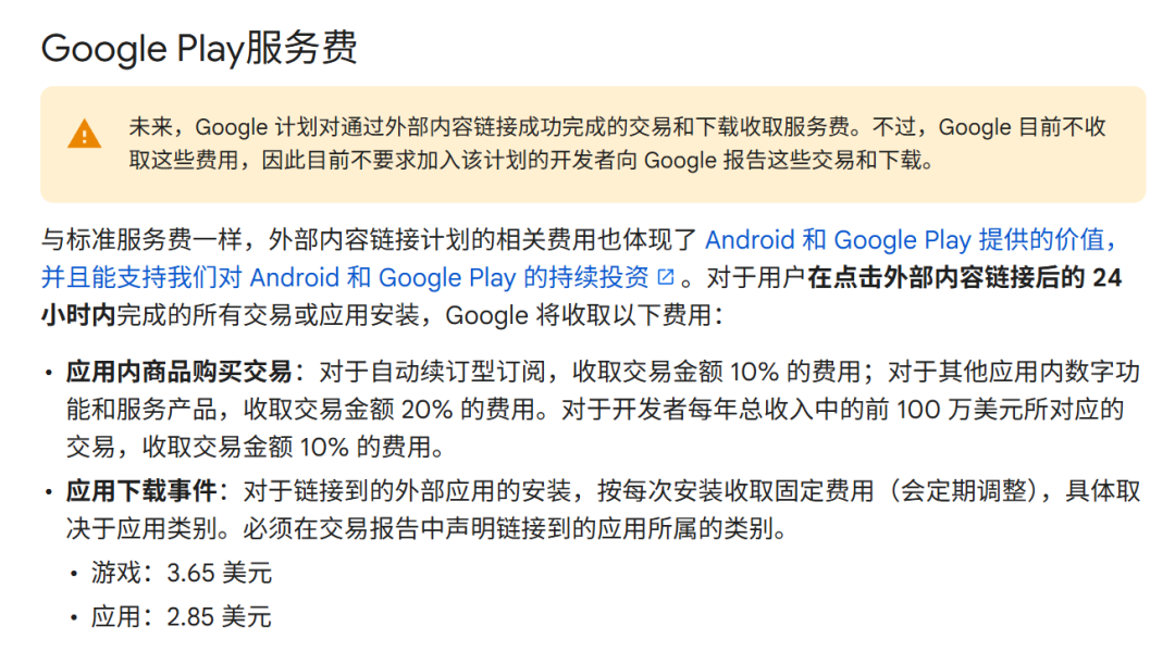 其次,收费规则的复杂性和合规成本的增加可能会成为出海团队的“隐形门槛”。App Store以及Google Play目前提供的三方支付合规方案虽然给开发者提供了一些跳转自由,但收费标准还存在一些模糊地带,比如Google Play的“外部内容链接”路径中提及:“游戏类APP每次安装收取3.65美元”,但对于“每次安装”的技术界定方式并未做出明确说明(比如游戏内下载或跳转到网页下载)。此外,以上提及的两种Google Play三方支付路径都需要集成谷歌的API并且支付一定的服务费用,也会给开发者带来一些隐性的成本。