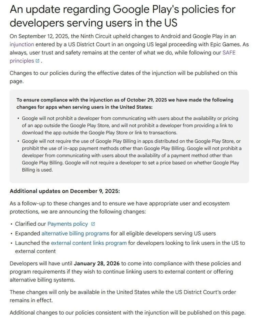 另外,Google Play的三方支付新政相比苹果而言要更为复杂——Google Play要求开发者必须在1月28日前完成合规,否则无法在美国合规启用外部支付。并且其三方支付在美区生效日期仅截止到27年11月1日。开发者需要额外注意。
