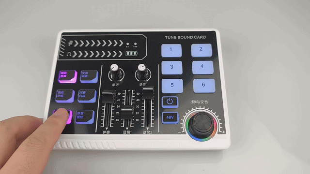 声卡的右侧区域提供了6个音效键,已经内置好了6种声音特效,有鼓掌、巴掌、哄笑、动感舞曲等,这6个音效键长按可以进行自定义音效,长按“复位”键又可以恢复出厂音效设置,可玩性非常高。底部则是电源和48V话筒的开关,以及混响/变音的旋钮