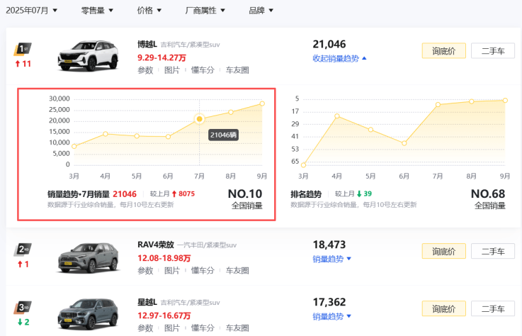今年的紧凑型SUV细分市场多少是让人有些看不明白了,先是吉利星越L打破常规,以13万起的合资车价位强势登榜(紧凑型SUV细分市场销量排行榜),吉利博越L紧随其后,从7月到9月,连续3个月蝉联紧凑型SUV细分市场销量排行榜“一哥”,这是什么情况啊?难道说吉利品牌的SUV“后劲十足”么?当初上市的时候,大家可都没这么肯定过。