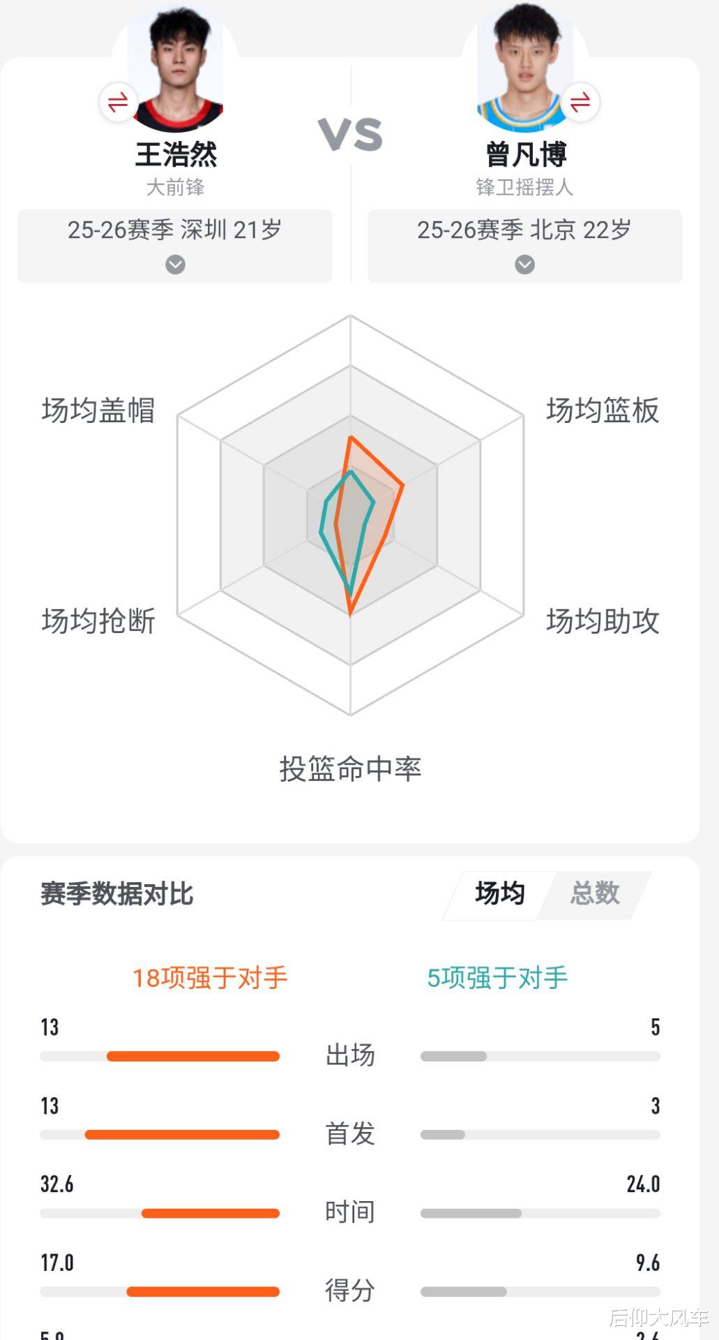 再来对比一下同类型的锋线,和曾凡博相比,王浩然有18项数据强于对手,场均得分多了将近8分,三分投篮命中率高出15.5%;