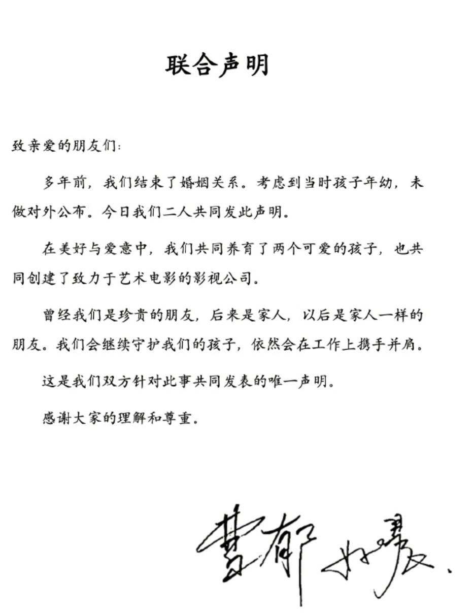 但比起这突如其来的消息本身,更让人唏嘘的是声明中另一句话:“多年前,我们结束了婚姻关系。考虑到当时孩子年幼,未做对外公布” 。