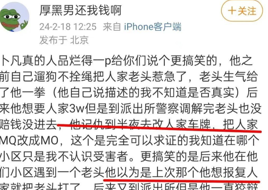 然而,更让人难以置信的是,这些只是冰山一角!据说卜凡竟然乱改别人的车牌号码,简直离谱到了极点。事情是这样的,卜凡之前遛狗不牵绳,结果惹急了人家老头,被给了一拳。虽然事后调解了,老头也没进去也没赔钱,但卜凡竟然记仇到半夜去改人家车牌号码!后来还想继续报复,结果竟然认错人了,打了另一个老头,还狡辩个没完。