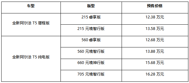 据悉,极狐全新阿尔法T5预售共推出6个版型,包含纯电和增程两种动力形式,预售价格12.38万元—16.28万元,以更年轻的设计风格、更强的动力续航、更智能的操控、更舒适的驾乘和天花板级的安全健康,为年轻家庭用户带来了中级SUV的新选择。即日起通过极狐APP或小程序支付2000元定金,购车可以享受整车5年或12万公里质保、三电终身质保、3年免费不限量数据流量、终身免费OTA升级、价值4999元充电桩安装抵扣券等四重礼遇,再次刷新中级SUV的价值标准!
