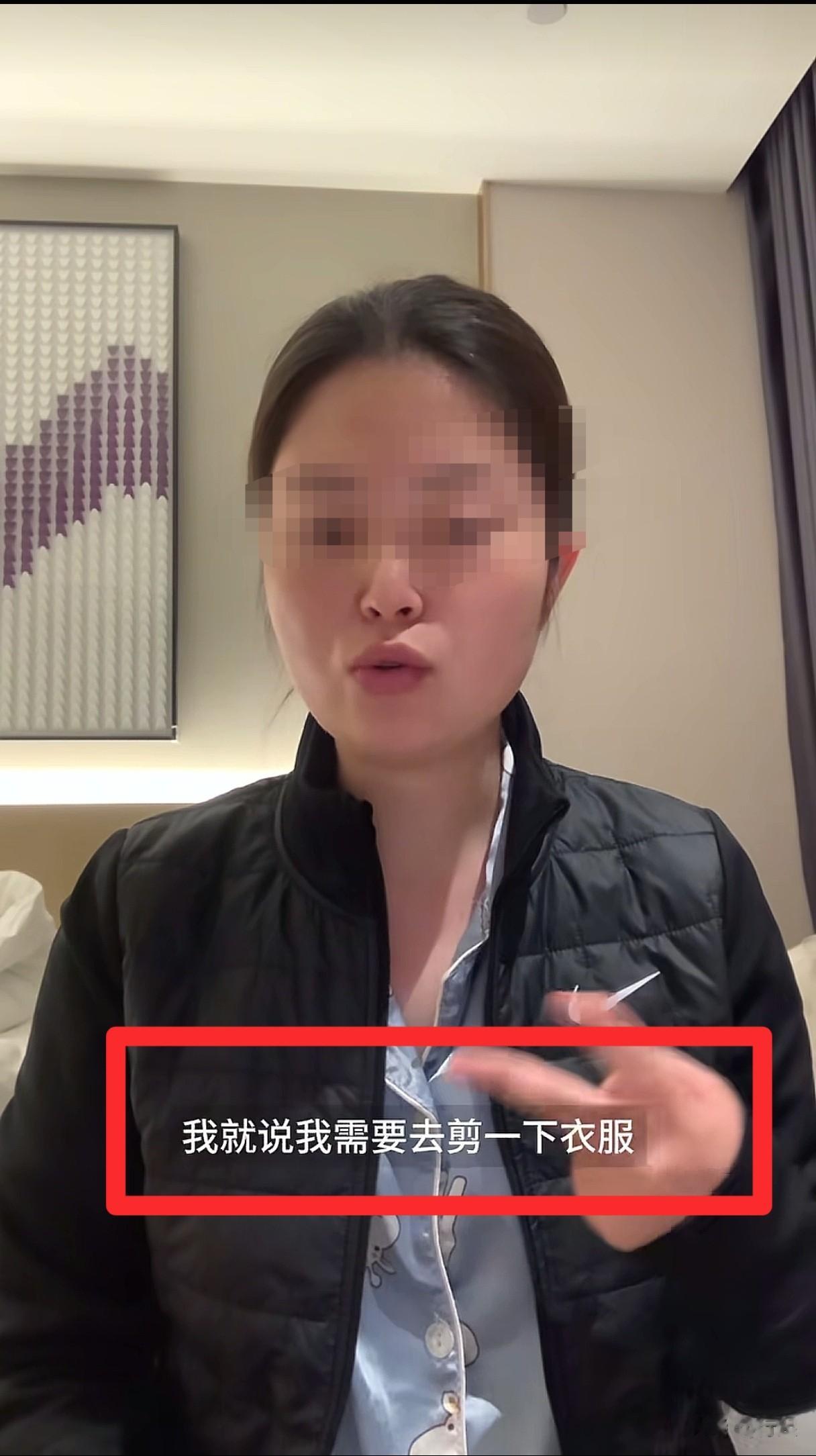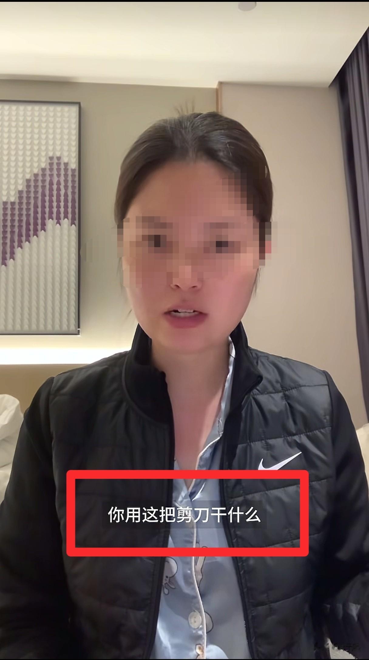 按照女子的说法,大约40分钟后,一名男性安保人员将剪刀送了上来。然而,她一开门就遭遇了安保的“质问”——对方坚持要知道她使用剪刀的目的,并不断催促她尽快使用,声称酒店急需这把剪刀。