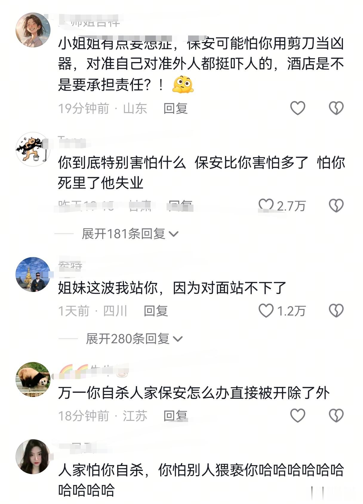 “应该给酒店的安保人员颁发一面锦旗”,一位网友的评论获得了高赞。许多人认为,安保人员的行为并非威胁,而是一种负责任的应急措施。