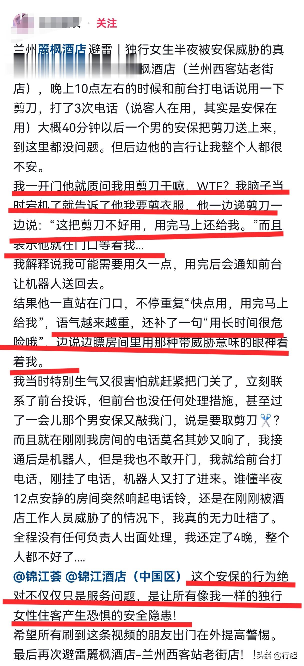 这句话让女子瞬间感到害怕。她立即关上门,打电话向前台投诉,称安保人员带有“威胁意味”。但更让她恐惧的是,过了一会儿,同一安保人员又来敲门取剪刀。