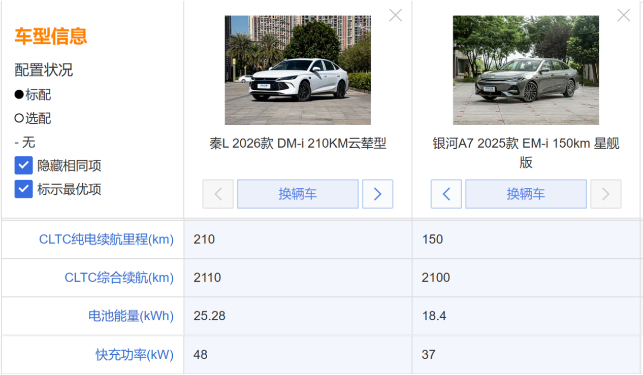 再看春节返乡跑长途,满油满电后,秦L综合续航2110公里,银河A7也能达到2100公里,两者都是行业领先水平,对于大部分用户来说,也都能实现“一箱油回家”。但有个细节值得关注,秦L DM-i的充电效率更胜一筹:快充功率48kW,比银河A7的37kW“回血”更快,春节出发前临时补能,或者服务区应急充电,秦L的效率优势能帮你省下不少时间。