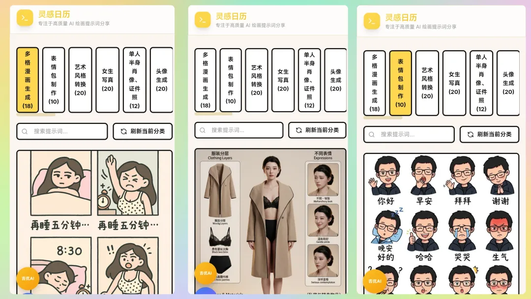 灵感日历小程序与Web站功能一致,从图片风格转换、宠物写真、儿童写真、情侣写真、表情包制作到电商产品图设计、摄影大师风格、创意玩法……提供超过20种不同类别共计400余组AI绘画提示词。