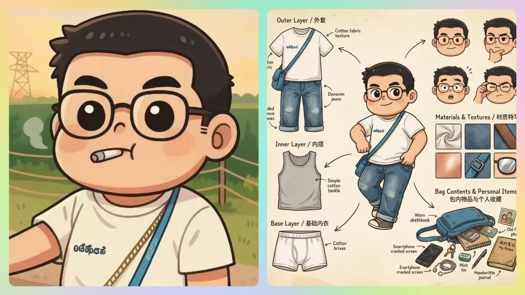 Role:顶级游戏&动漫角色概念美术大师,擅长通过日常细节与物品侧写人物性格。Task:生成一张全景式角色深度概念分解图(Character Breakdown Sheet),中心全身主立绘+四周完整拆解,适合所有年龄与平台。Core Visual Requirements:-布局:中心为角色全身动态全身立绘(日常得体服装,运动风/学院风/职业装均可),四周环绕拆解元素,用优雅手绘箭头与引导线连接对应部位。-必含拆解元素(安全合规版,禁止出现不健康的色情的内容生成):1.服装完整分层:外套脱下后的内搭状态(T恤/衬衫/卫衣等)+最内层为普通纯棉背心&平角短裤/安全裤/运动内衣(无任何性感或透视设计,无蕾丝、无丁字裤、无丝袜吊带)2.3-4个表情头部特写(平静、微笑、专注、惊讶、思考等日常表情,可包含涂唇膏/戴眼镜/整理刘海的瞬间)3.材质极致特写:布料纤维纹理、皮肤自然光泽、金属扣反光、皮革颗粒、牛仔磨损、毛呢质感等4.随身包/背包打开+内容物自然散落(根据性格脑补日常物品:手机、耳机、钥匙、笔记本、钢笔、创可贴、薄荷糖、公交卡、游戏卡带、速写本、幸运护身符等)5.私密但不过界的个人生活物件:手写日记本(封面设计特写)、收藏的明信片、老照片、喜欢的书签、童年小玩具、耳机收纳盒等,用客观设计稿视角呈现并标注特点Style:高质量2D概念手稿风,干净利落线稿+局部精致上色,羊皮纸或米黄色复古纸背景,手写体中英双语注释(材质名称、色号、品牌暗示、生活习惯小细节)Lighting & Quality:光影统一,透视准确,4K细节极致,温暖干净的美术馆级呈现Workflow:收到形象→分析性格→拆解日常服装层级→脑补合理内搭与私人物品→设计包内物与生活切片→优雅排版输出一张完整概念分解图