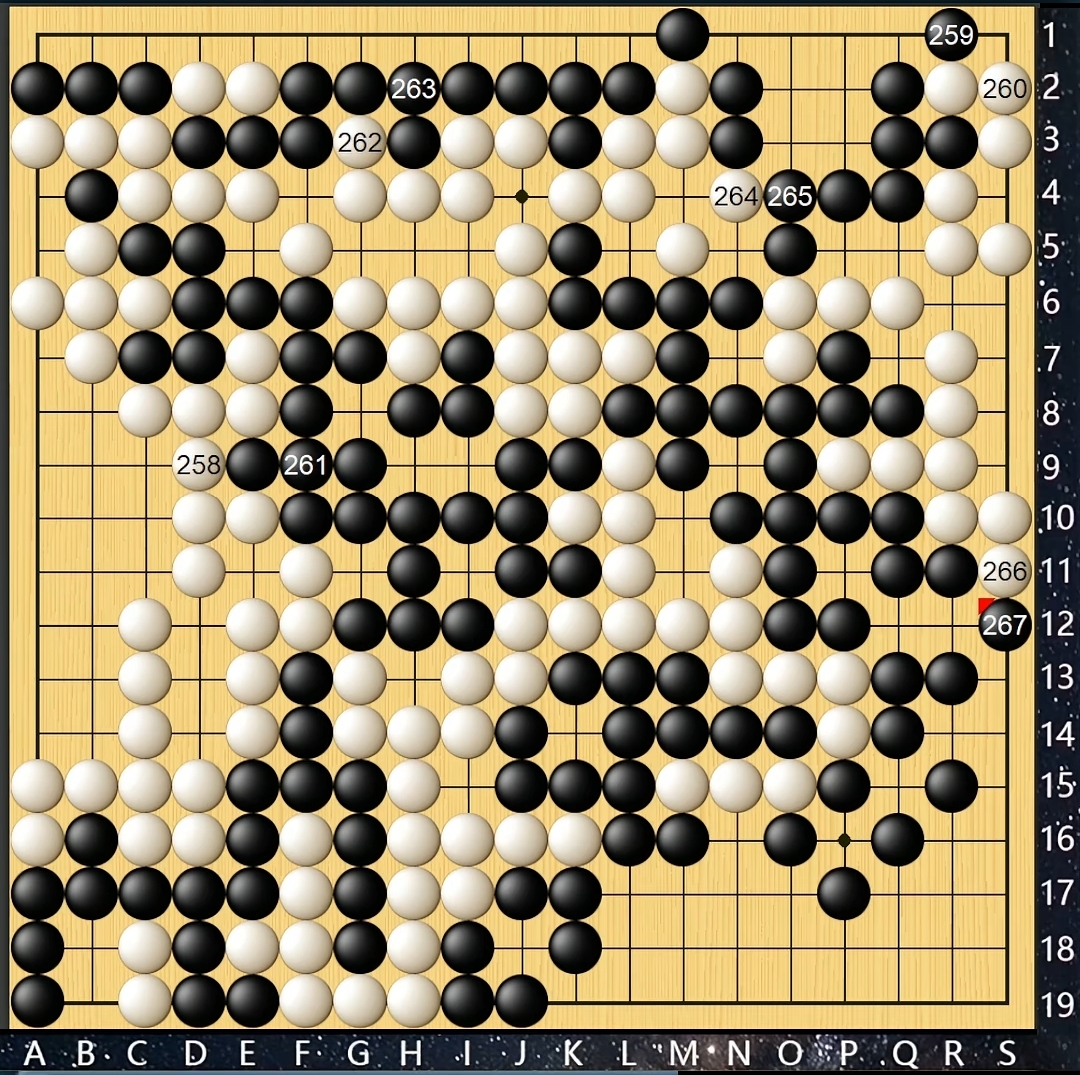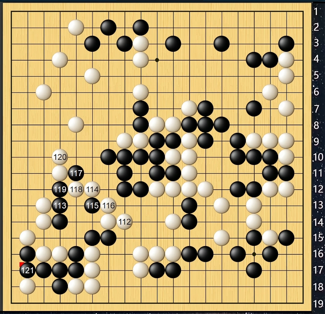 白棋进退有序、张弛有度,至中盘阶段完全碾压对手。黑棋一直在隐忍中等待时机,步调虽慢却特别扎实。白棋在轻松处理中腹大龙之后挥师左上角,黑棋仍然保持平和心态、从容应对,似乎有意将棋局导入官子争胜负细棋局面。