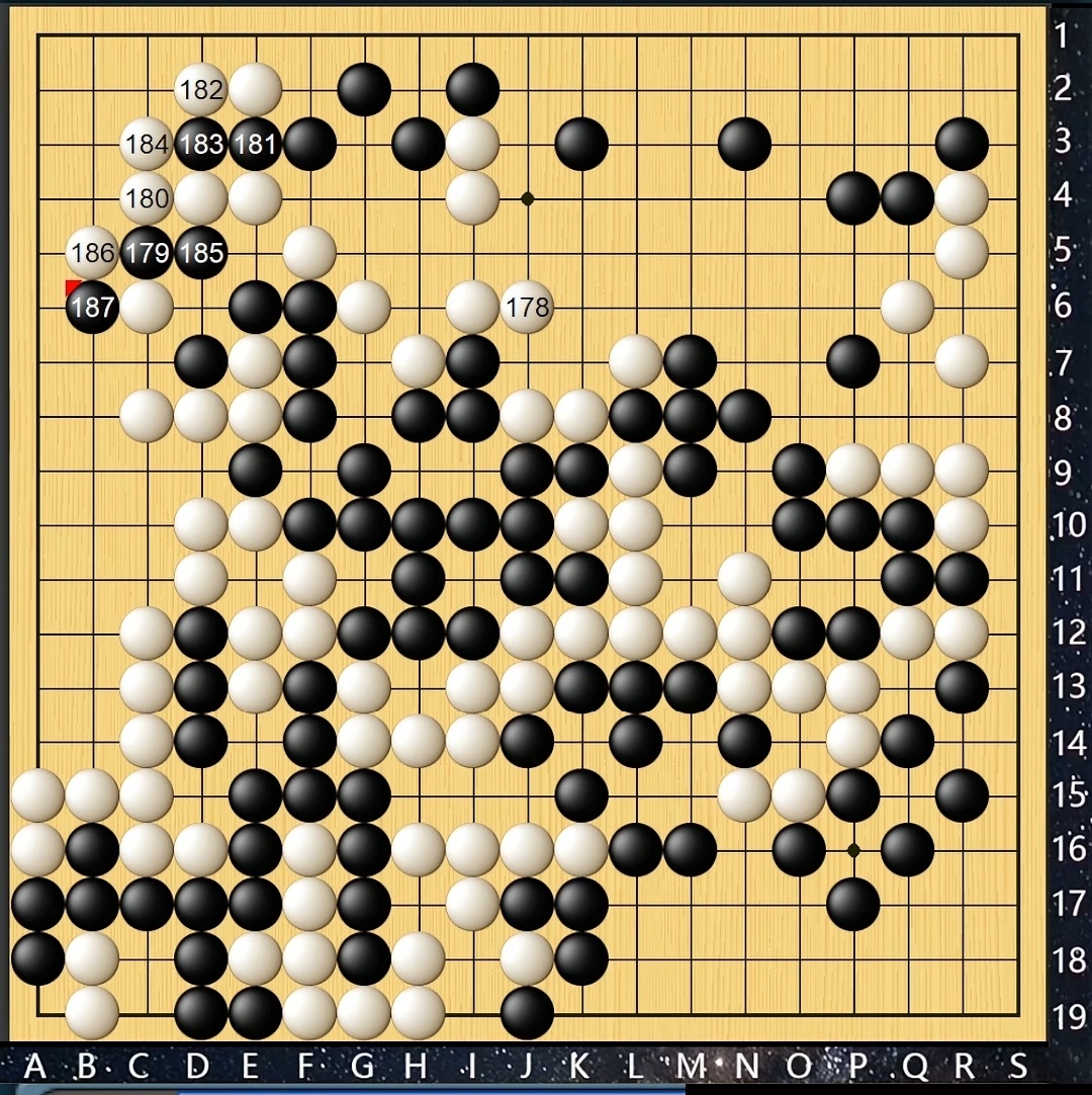 真的是想啥来啥,瞌睡了有人递枕头。这次轮到藤泽里菜出昏招、送大勺,双方形成比气杀、白快一气杀黑,实现超级大逆转。究其原因黑121是罪魁祸首让白棋死里逃生,巨大的幸福从天而降,直叫人怀疑人生。不过战斗仍在继续,白178单长、过于逞强斗狠没有及时收手,局势再度混沌不明。黑179飞靠、胜负手,在黑棋一顿猛如虎操作下,白182单退忙中出错,局面再度反转。