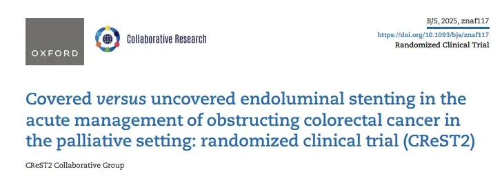 2025年9月BJS杂志发表了一篇题为“Covered versus uncovered endoluminal stenting in the acute management of obstructing colorectalcancer in the palliative setting: randomized clinical trial (CReST2)”的文章,首次用多中心、双盲、Ⅲ期RCT的体量,把“覆膜vs裸支架”拉回科学跑道,为“长寿时代”的支架耐久度给出硬证据。