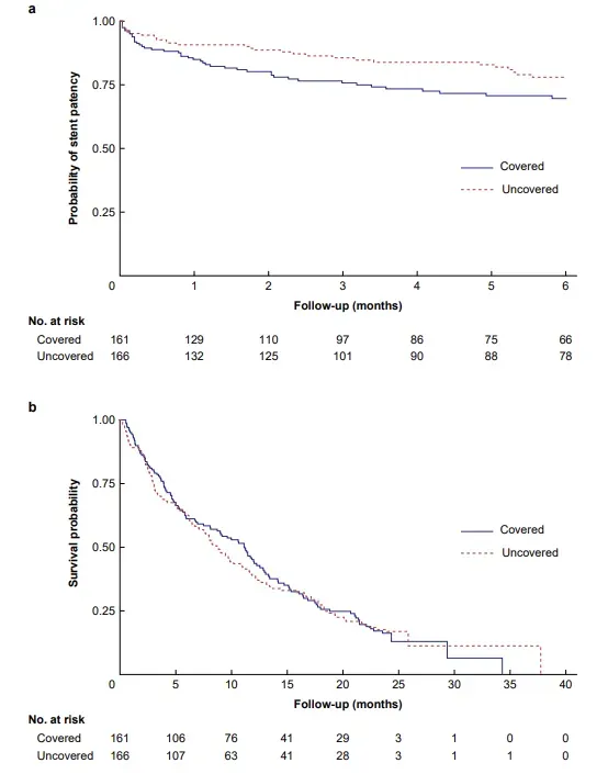 再干预:覆膜组8.1%需二次内镜,裸支架3.6%,P=0.13;造口率均低于7%,差异无统计学意义。生存:6月生存率62.1% vs 63.9%,总生存24.8% vs 25.3%,曲线几乎重叠(HR 0.98)。