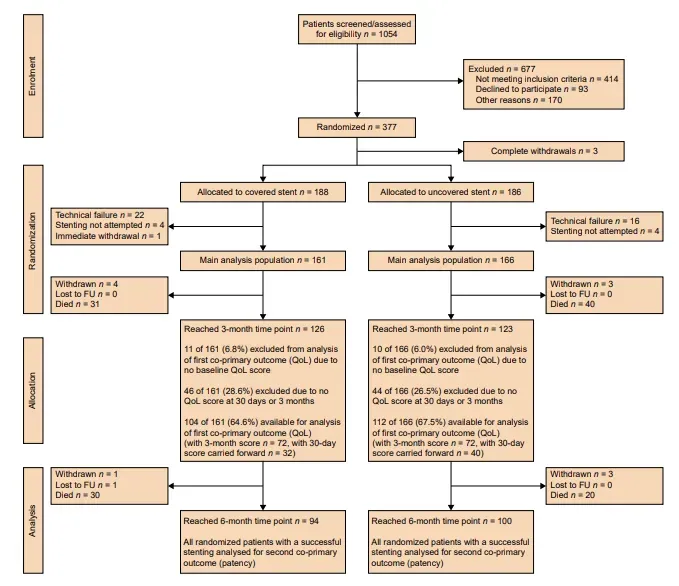 本研究是一项28家英国NHS医院参与的Ⅲ期随机对照试验,旨在比较覆膜与裸金属支架在姑息性左半结直肠癌梗阻中的6个月通畅率与生活质量。纳入标准>16岁、CT证实不可根治的左半结肠梗阻;排除穿孔、腹膜炎、拟用贝伐珠单抗及直肠下段梗阻。共377例患者1:1中央随机,盲法仅对操作者开放,其余医患随访均不知支架类型。