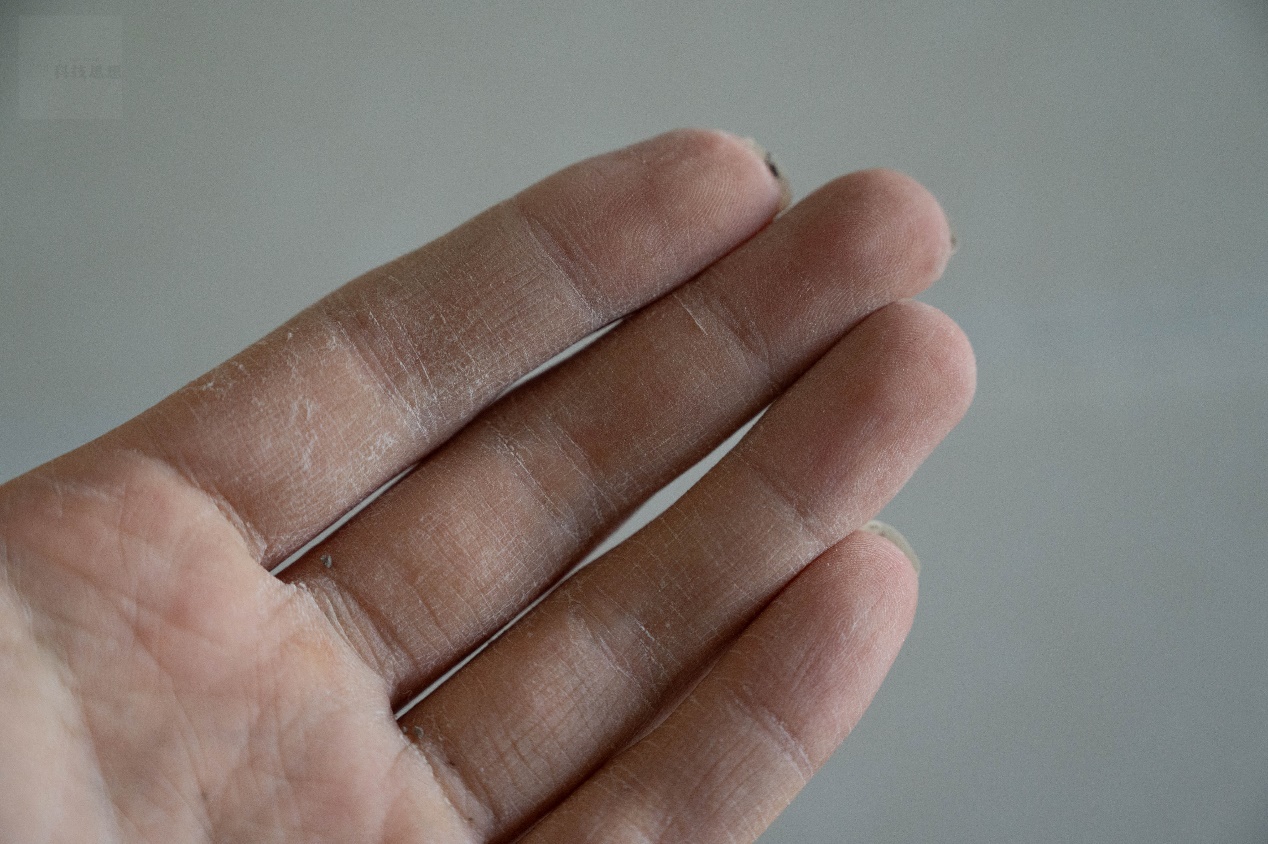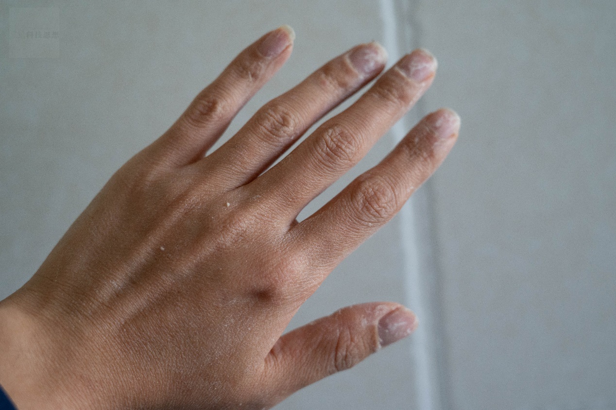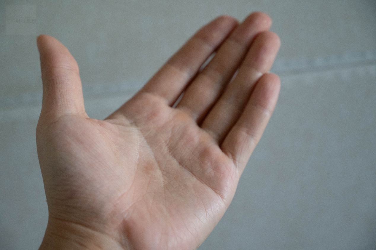 清洁力的验证可以通过几个简单的测试来观察。首先可以看一下清洁残留的效果,我们事先在手上沾染一些油脂粉尘,然后通过这款洁面乳进行清洁。