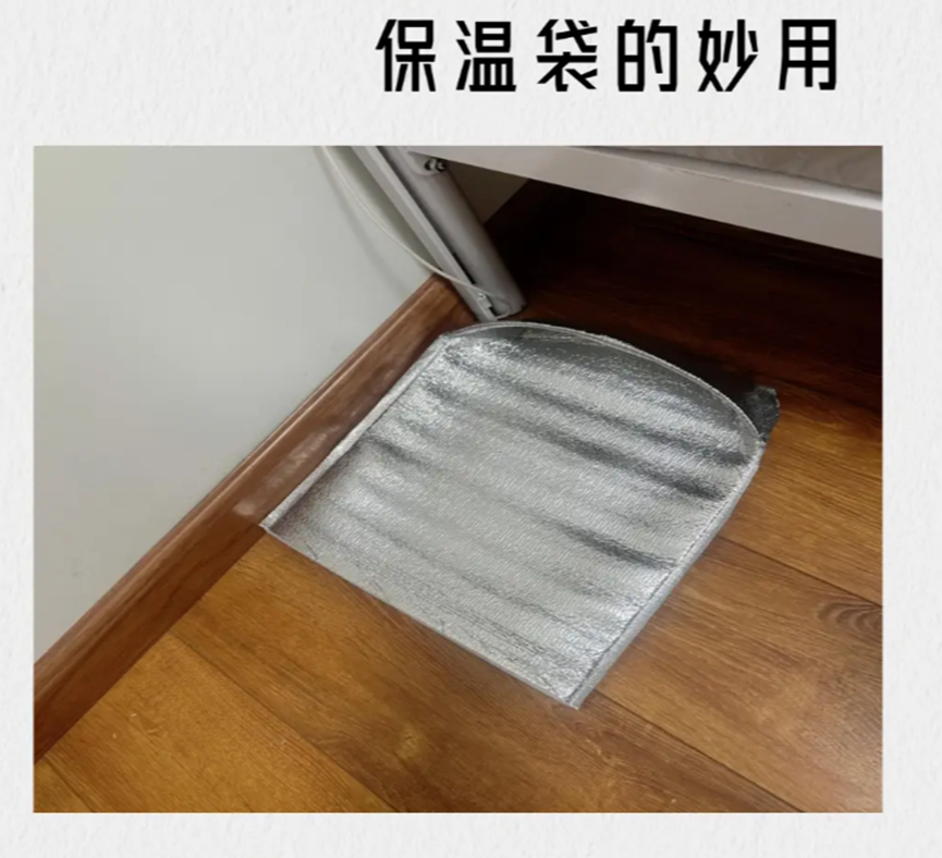 在这种情况下,大家就可以就地取材,直接使用点外卖时送下来的保温袋,自己制作一个简易版的门缝密封条。
