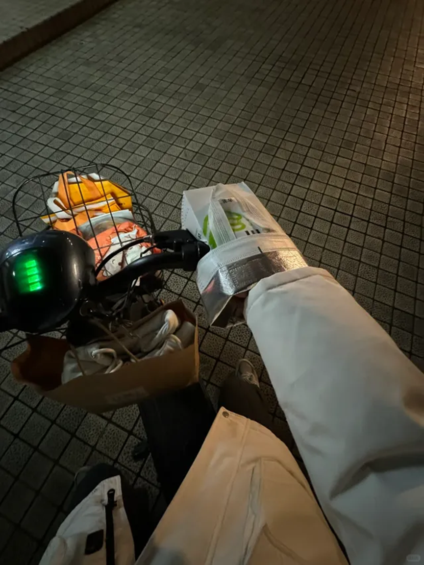 这个时候大家只需要使用外卖的保温袋进行一下加厚和固定,就能够达到更好的防风效果了,这样就算是在寒冷的冬天,也不用担心骑车的时候会冷了。