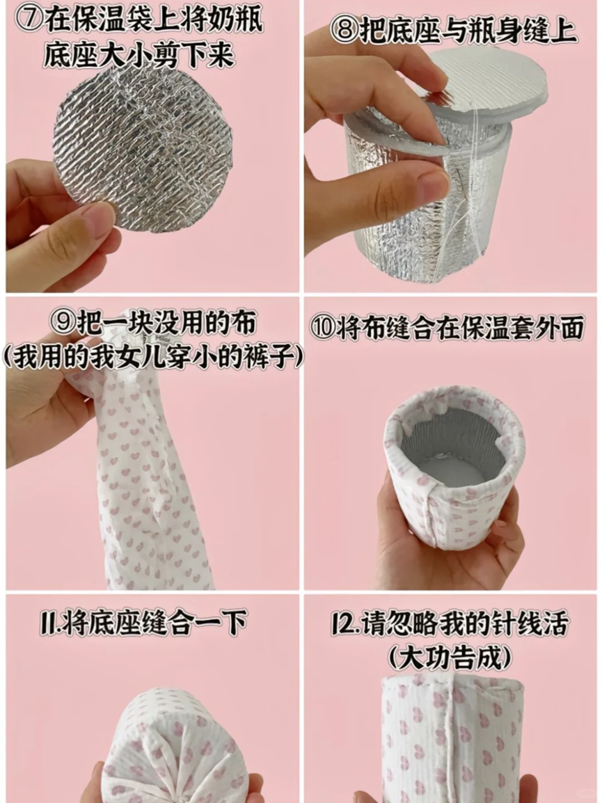 这样就能够自己做成一个奶瓶保温套了,不仅保温效果很好,而且还不需要花钱,实在是太妙了。