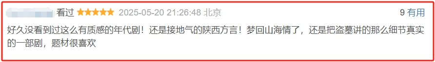 好久没看到过这么有质感的年代剧,还是接地气的陕西方言,梦回山海情了。还是把盗墓讲的那么细节真实的一部剧,题材很喜欢!
