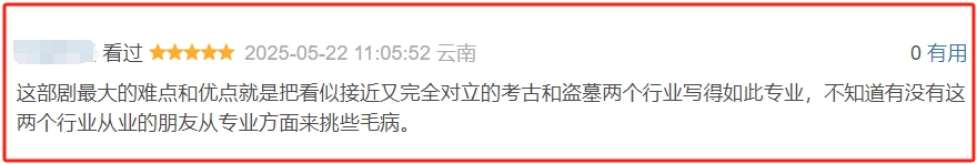这部剧最大的难点和优点,就是把看似接近又完全对立的考古和盗墓两个行业写得如此专业,不知道有没有这两个行业从业的朋友,从专业方面来挑些毛病。