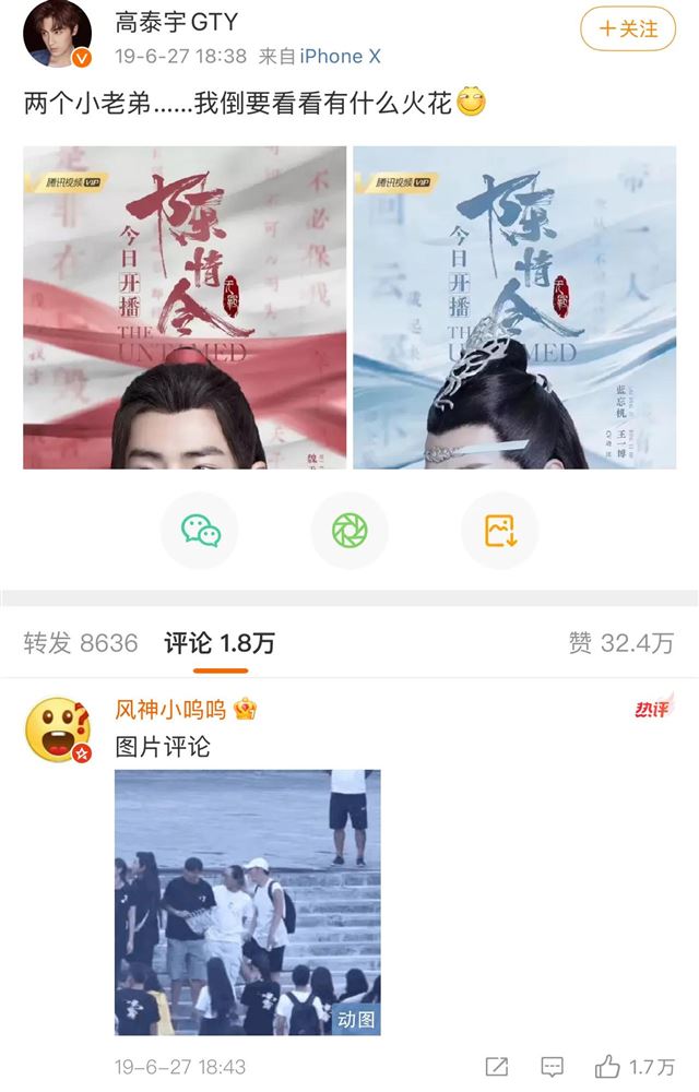更让人意外的是,他在微博上还提到了《陈情令》的互动,称肖战和王一博是“两个小老弟”。