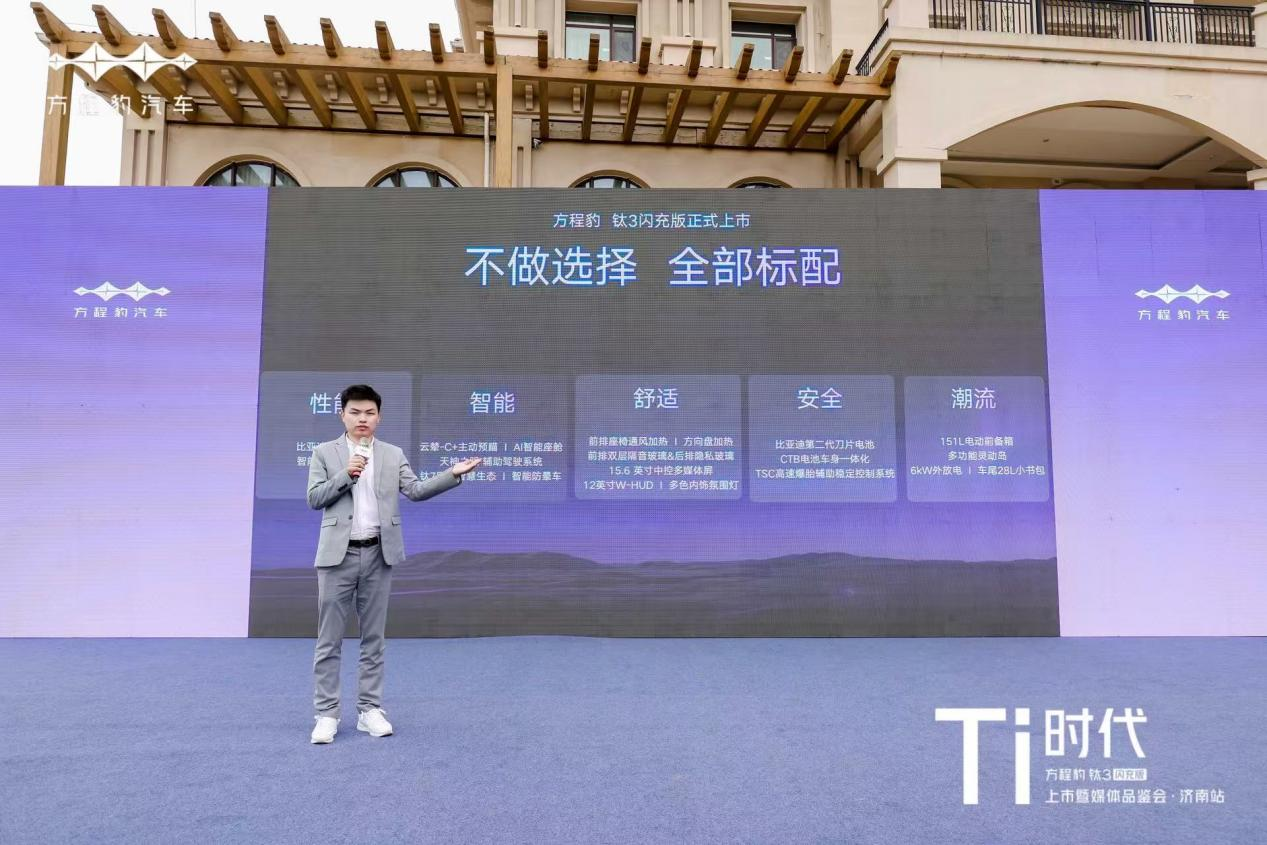 在新车推介环节,方程豹汽车鲁北大区运营经理宋林涛先生登台致辞,强调:“Ti时代,代表着技术不再高高在上,而是每一天、每一程都能被用户感知的出行自由。5分钟充好、9分钟充饱,这不是实验室数据,而是每一位车主都能享受的日常。”