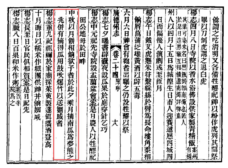 光绪《广德州志》:“中秋,以月饼向饷。欲子者,于此夕乘月摘南瓜,为梦熊之兆。并有摘得瓜,鼓吹爆竹以送姻戚。”
