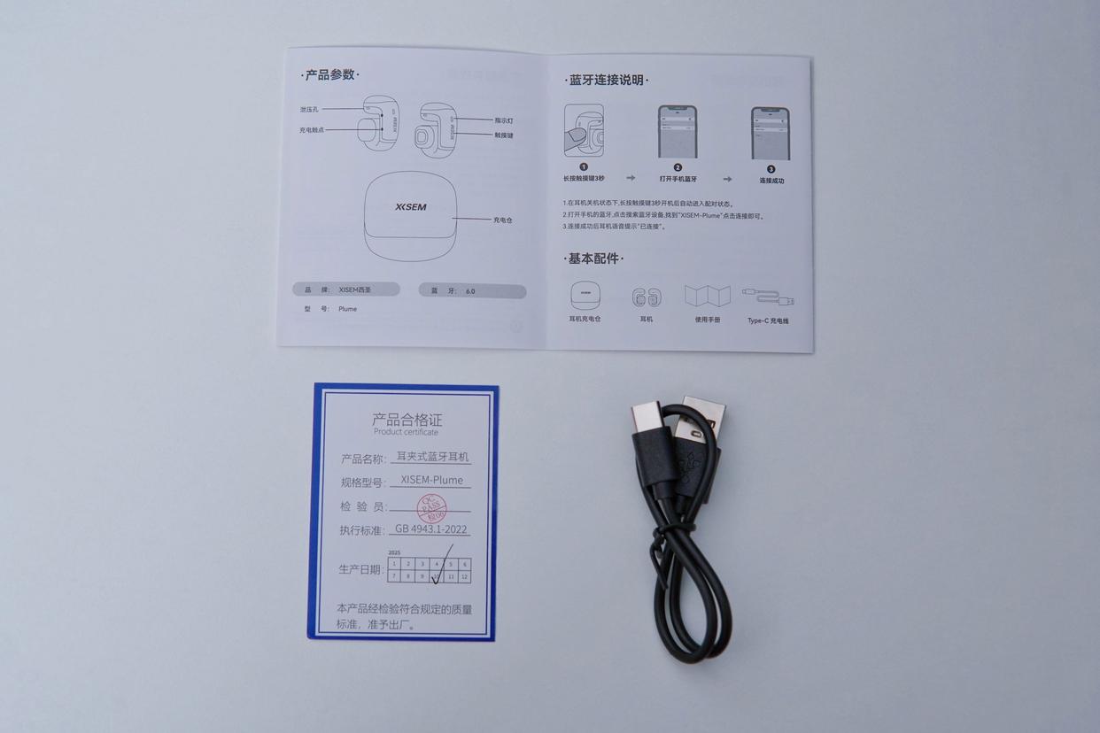 ▲打开包装,除了耳机和充电盒外,倒是也简单,包含一份说明书、一份产品合格证和一根USB-A to Type-C线。说明书虽然不厚,但内容倒是详实的,图文结合,可读性强。