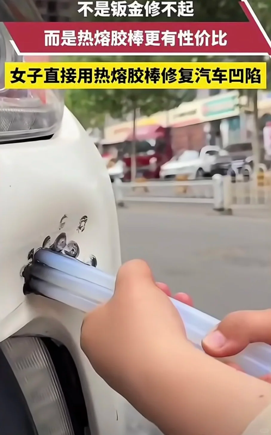 把热熔胶棒全都怼在上面,等到热熔胶棒冷却了之后,再往外拔,利用这个惯例,将汽车凹陷慢慢的修复,