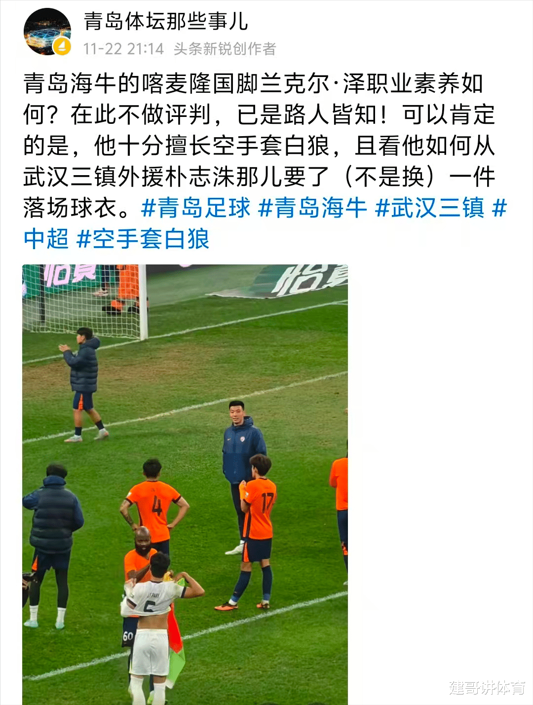 这家官方青媒记者称:不评价喀麦隆国脚兰克尔的职业素养,已经是路人皆知,但他十分擅长空手套白狼,举列武汉三镇外援朴志洙,兰克尔就做到了从朴志洙手里要到了一件落场球衣,不是交换球衣。从青岛官媒记者的观点来看,兰克尔没有参加青岛海牛的保级生死战,多少还是让青岛球迷有些失望的。