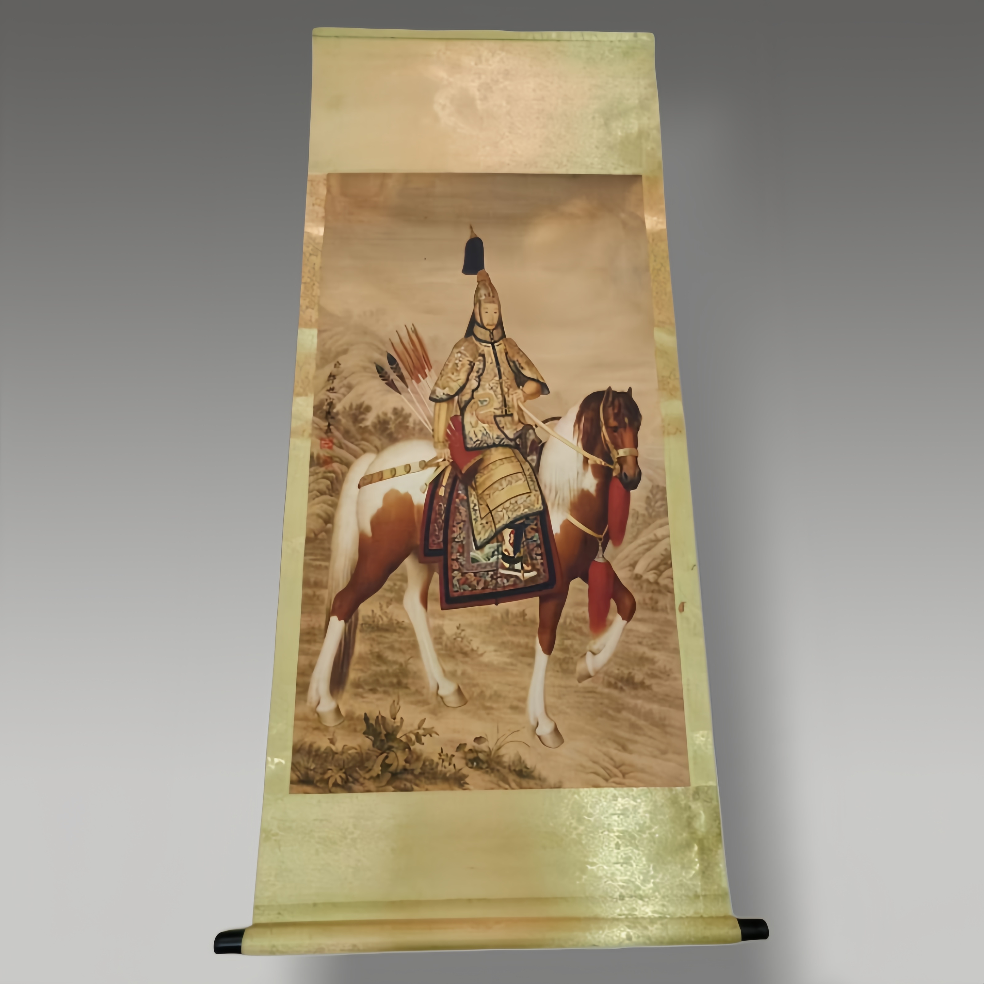 这幅画绘着鎏金戎装、乘花马,工笔细腻显甲胄华彩,配箭矢添勇武气,背景淡染山水,尽显帝王骑猎威仪