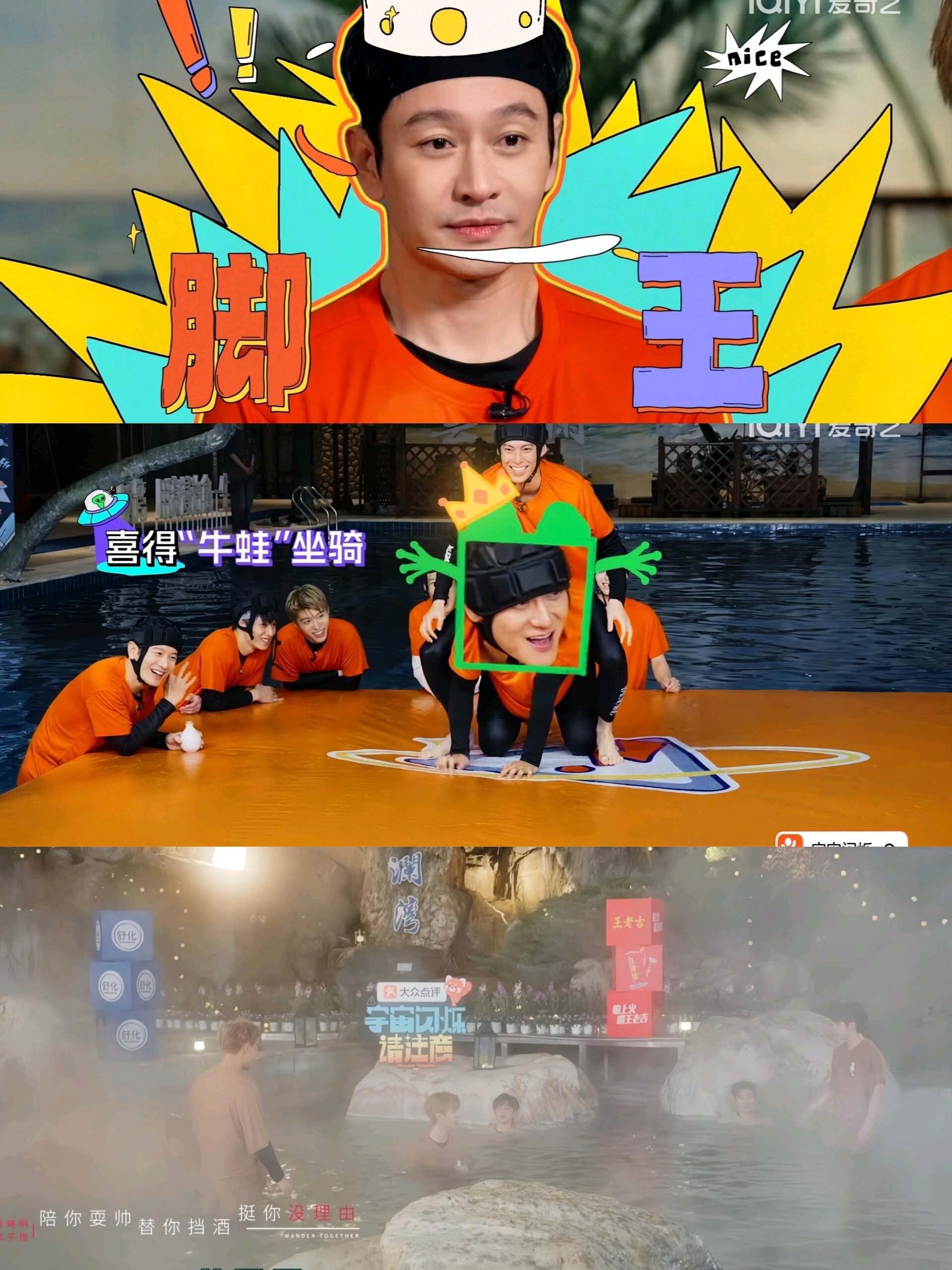 脚力推推赛中,黄晓明凭借一身力气,用脚在水里“闯出一片天地”,拿得本场游戏环节冠军。浪里头铁环节更好玩了,不能用手只能用头,最后留在上面的人获胜,各种滑稽动作不断上演。黄子韬因为身体原因最后一个上场,结果还是逃脱不了被王鹤棣再次制裁的命运。到了温泉里,热气腾腾的水雾中,爆闪团开始合唱主题曲,唱完抓住范丞丞评价,来自黄子韬跟于洋的目光凝视,范丞丞的夸夸模式开启了~