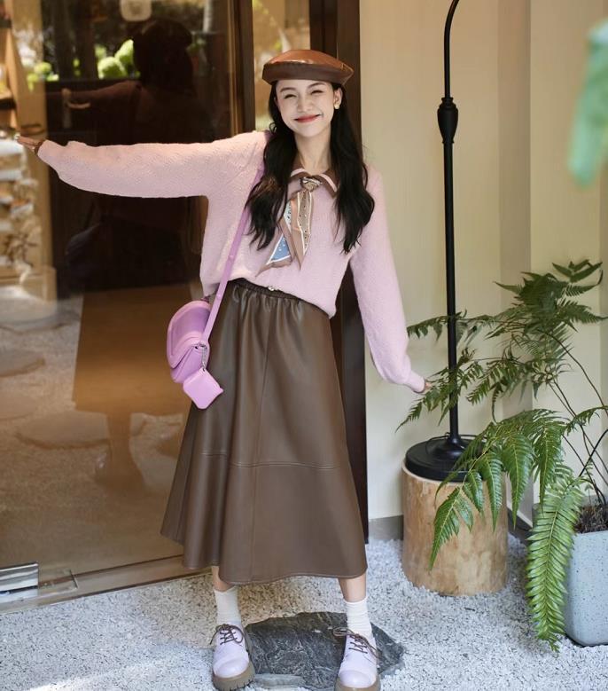 自带复古气息的棕色皮裙,也是今年春天很流行的颜色之一,这个色调比起黑色,有过而不及的优点。淡粉色毛衣配棕色半身长裙,没想到吧?这么一种颜色的裙子,与淡粉色毛衣相配,也是毫无违和感的。