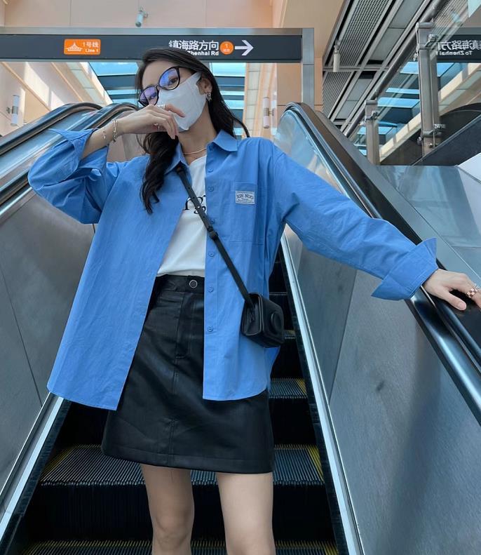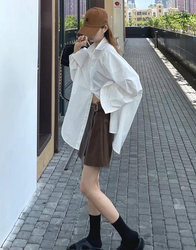 搭配一件白色衬衫,宽松版型的衬衫,可是超级包容身材缺点的,显瘦更藏肉。衬衫的下摆可以稍微塞一点进去裙子里面,从而营造出几分随性感。